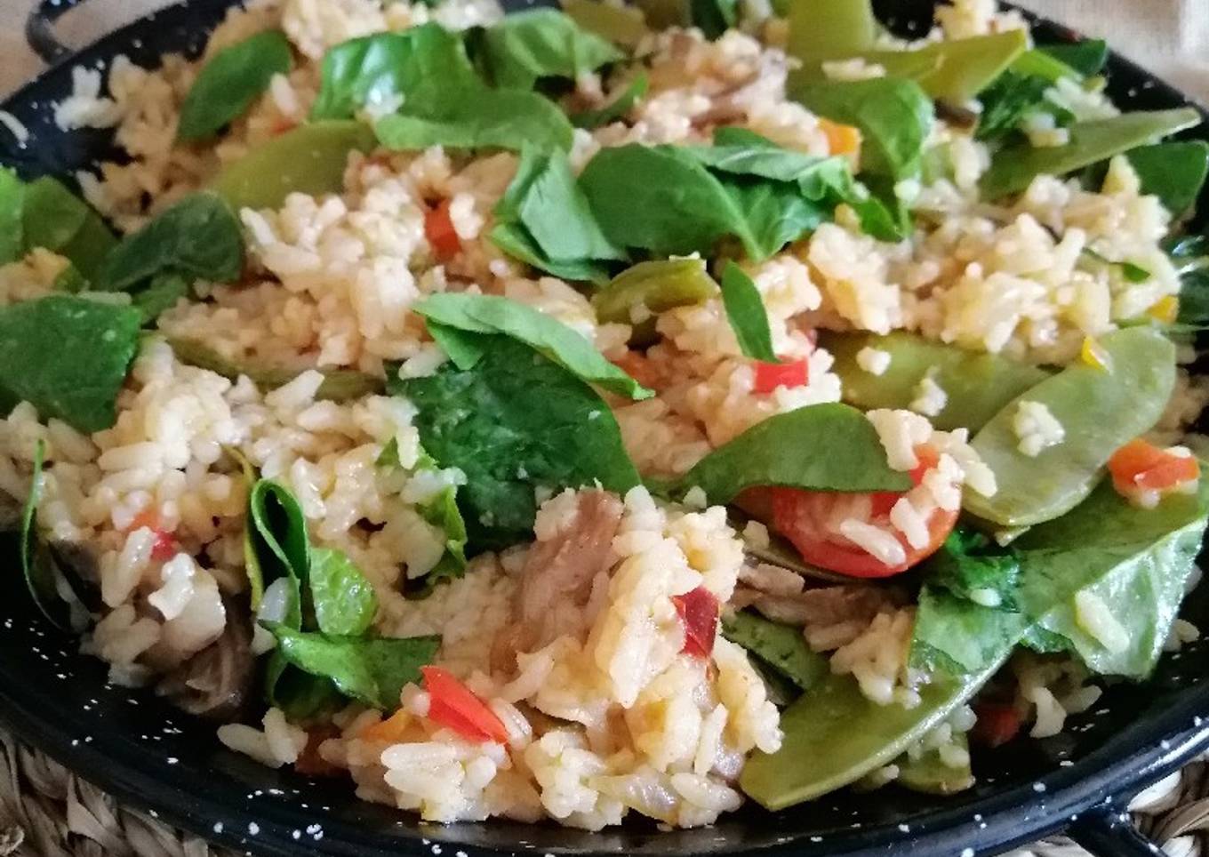 Steps to make to make Arroz con tirabeques, setas y espinacas
