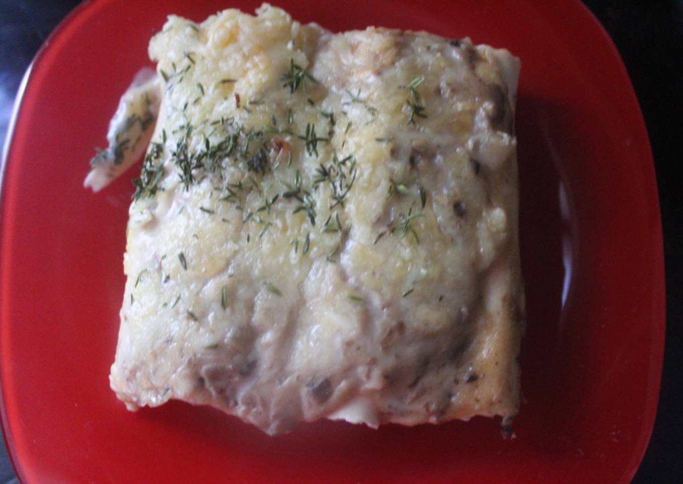 Son unos simples canelones congelados, pero en lugar de cubrirlos con bechamel, he optado por cubrirlos con una salsa de setas también preparadita.