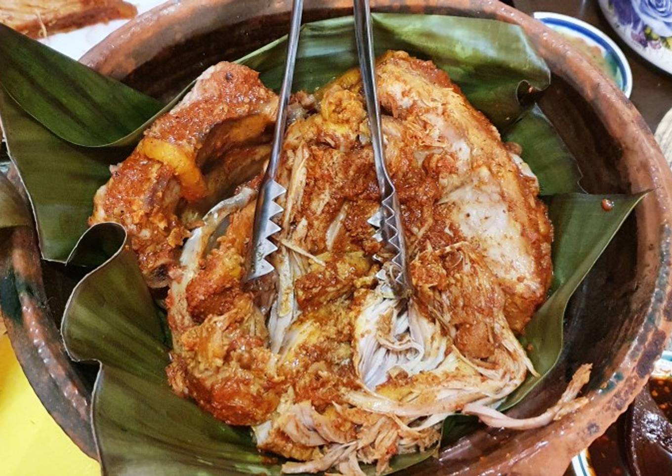 - En un recipiente con tapa hacer una cama con las hojas de plátano, poner la carne con la marinada, agregar la manteca derretida, cubrir con las hojas de plátano y tapar, lo que se intenta es que guarde lo más posible el vapor. Si no tiene suficiente líquido durante la cocción se puede agregar agua.