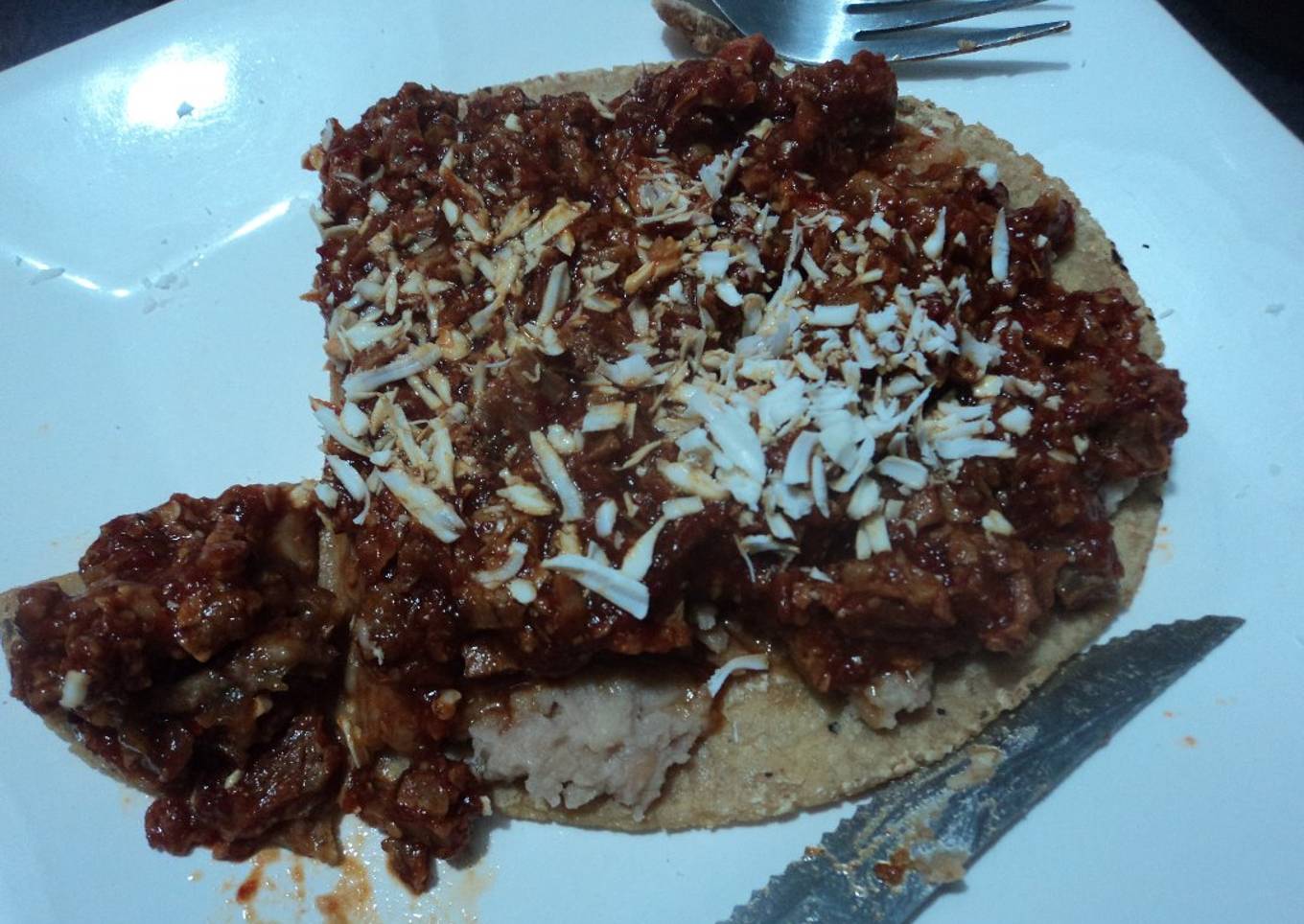 Huarache pa' enamorados con coco y chicharrón prensado agridulce Don Geras
