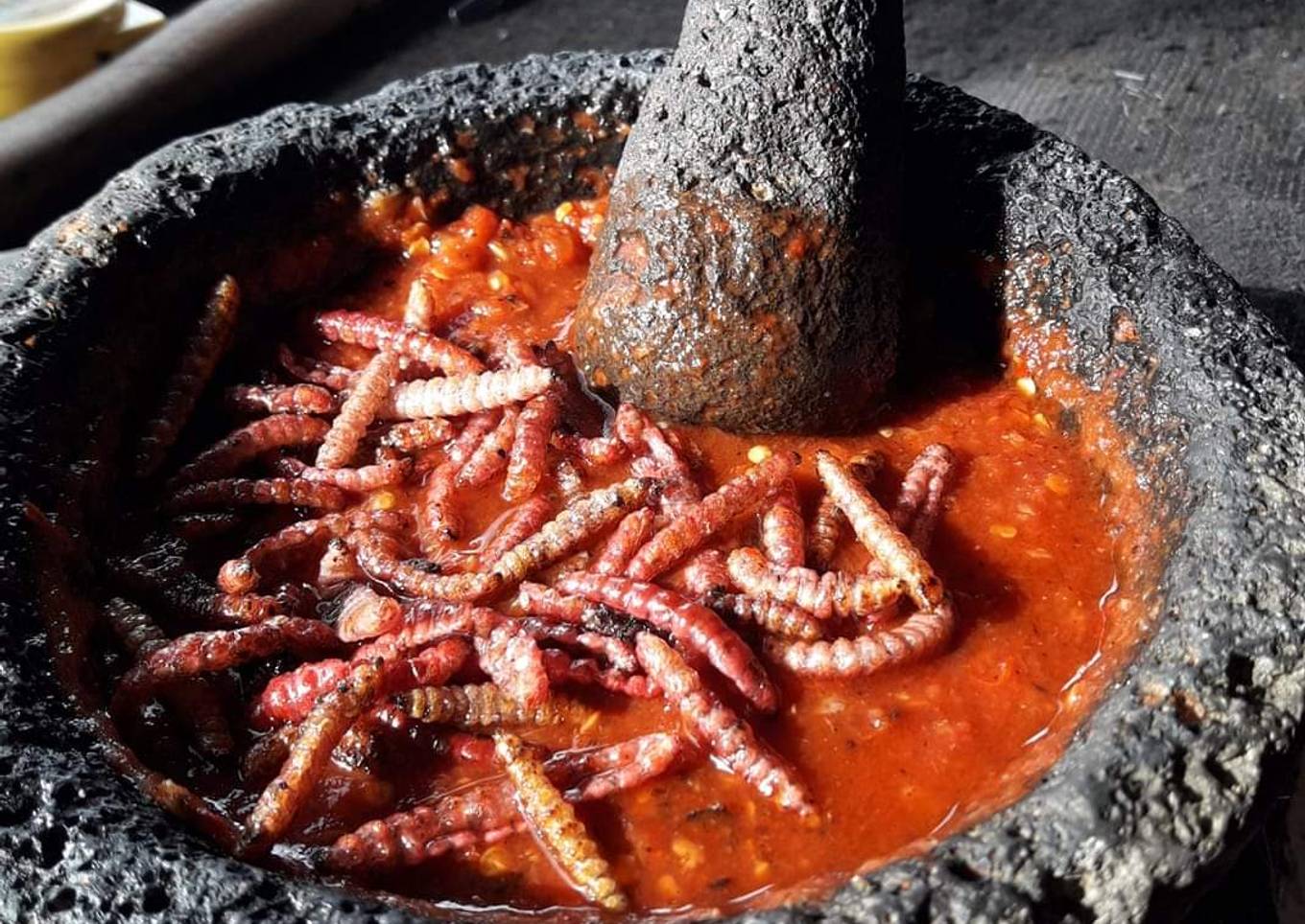 - En un molcajete colocar la sal, ajo y cebolla, comenzar a machacar, añadir los chinicuiles, jitomates y chiles, machacar hasta triturar, agregar un poco chorrito de pulque y mezclar, nuestra salsa estará lista para saborear